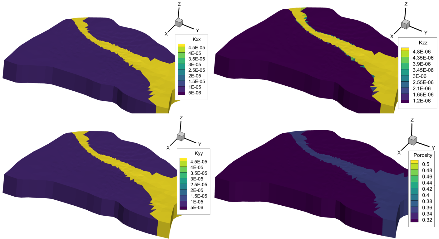 In this simplified version of the R5 model we have applied spatially varying Kxx, Kyy, Kzz, porosity and specific storage to the entire model domain (with the exception of a small clay lens). We’ve also demonstrated the linear interpolation capability for the Kzz property field. Finally, we’ve written the conductivity and porosity fields to Tecplot for visualization (see this post for more info about ‘to tecplot’ commands). Lines 89-148 of the R5.grok file assign these porous media properties: