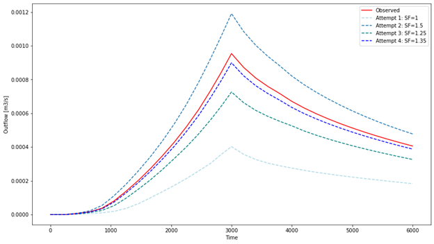 Figure 2: Output hydrographs as a function of scaling factor (SF)